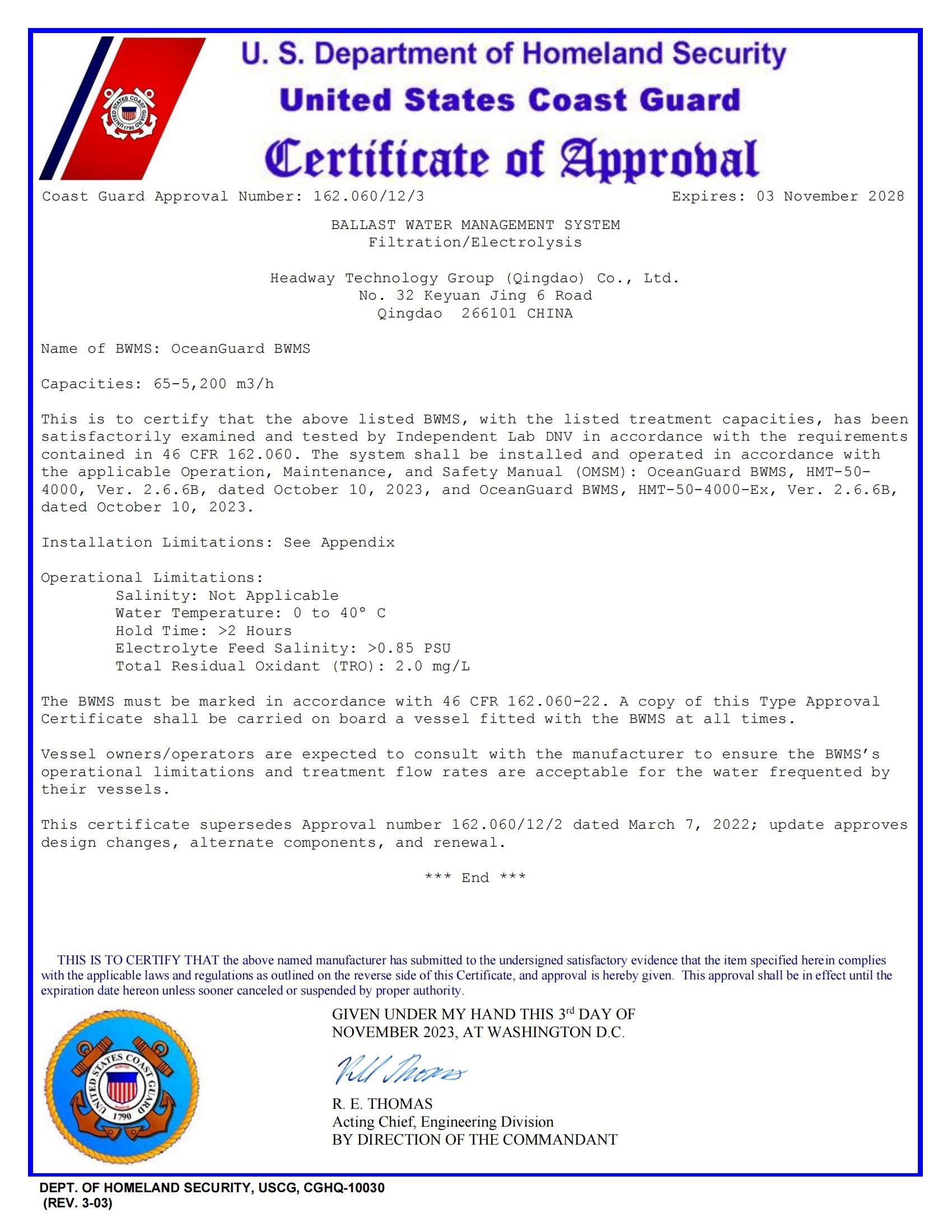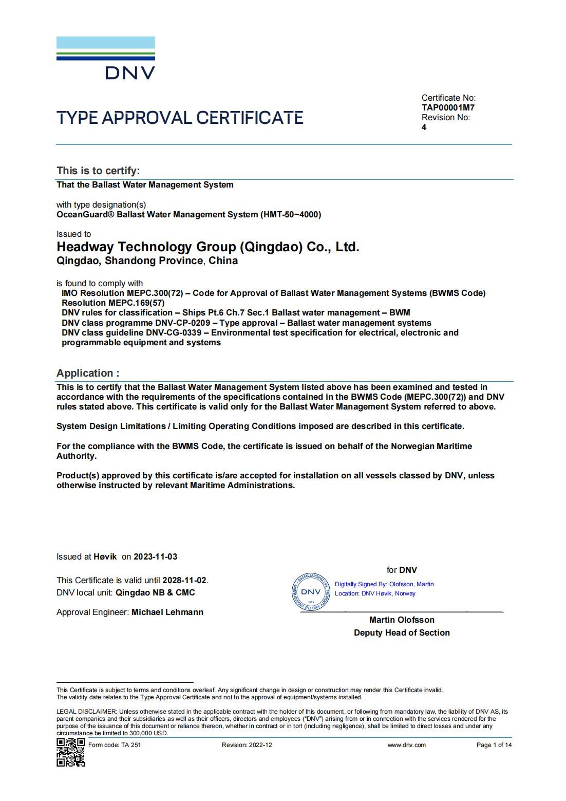 海洋衛(wèi)士?壓載水管理系統(tǒng)(BWMS)采用“電催化高級氧化技術(shù)”,具有單次處理、體積小、無氫氣、超低能耗,以及不受水域鹽度、溫度、濁度影響等優(yōu)勢。系統(tǒng)擁有涵蓋近20個主流船級社和船旗國在內(nèi)的全面認證,訂單量與市場份額穩(wěn)居世界前列。